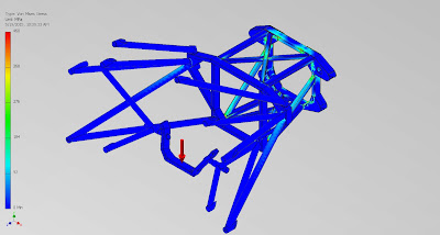 Another FEA study for the rear frame which was done in Autodesk Inventor, Rear Frame is quite similar to Galmer GT rear frame (due to same power and gear train) with some differences and this one is symmetric. Torque range varies from 15000Nm to 80000Nm and torsional stiffness 79225.5221 Nm/degree which is mathematically achievable but failure occurs on some beams (eg. gearbox frame diagonal brace) beyond 50000Nm Torsional load. yet model is not perfect there are some residual stresses due to CAD design of the beam which the don't contact perfectly. calculation was done with 847676 elements (1635684 nodes). Detail of beams increases close to where torsional load was applied. Calculation to about 27 hours on incremental loads and computer crashed 5 times. otherwise calculation would have been less. Material used: 4130 Chrome-Molybdenum alloy steel which has a yield point at 460 MPa.